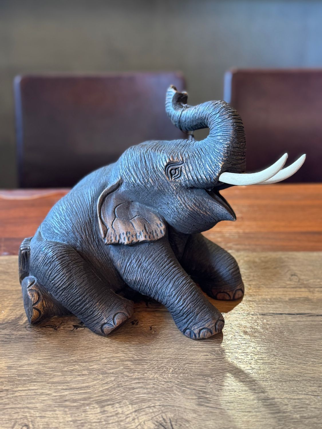 Hand carved wooden elephant sculpture, solid wood and stained dark brown color, Home decoration, unique handcrafted from Thai artist, Elephant is representing the symbol of Thailand, they often represent good luck, prosperity and protection. Made in Thailand (H)